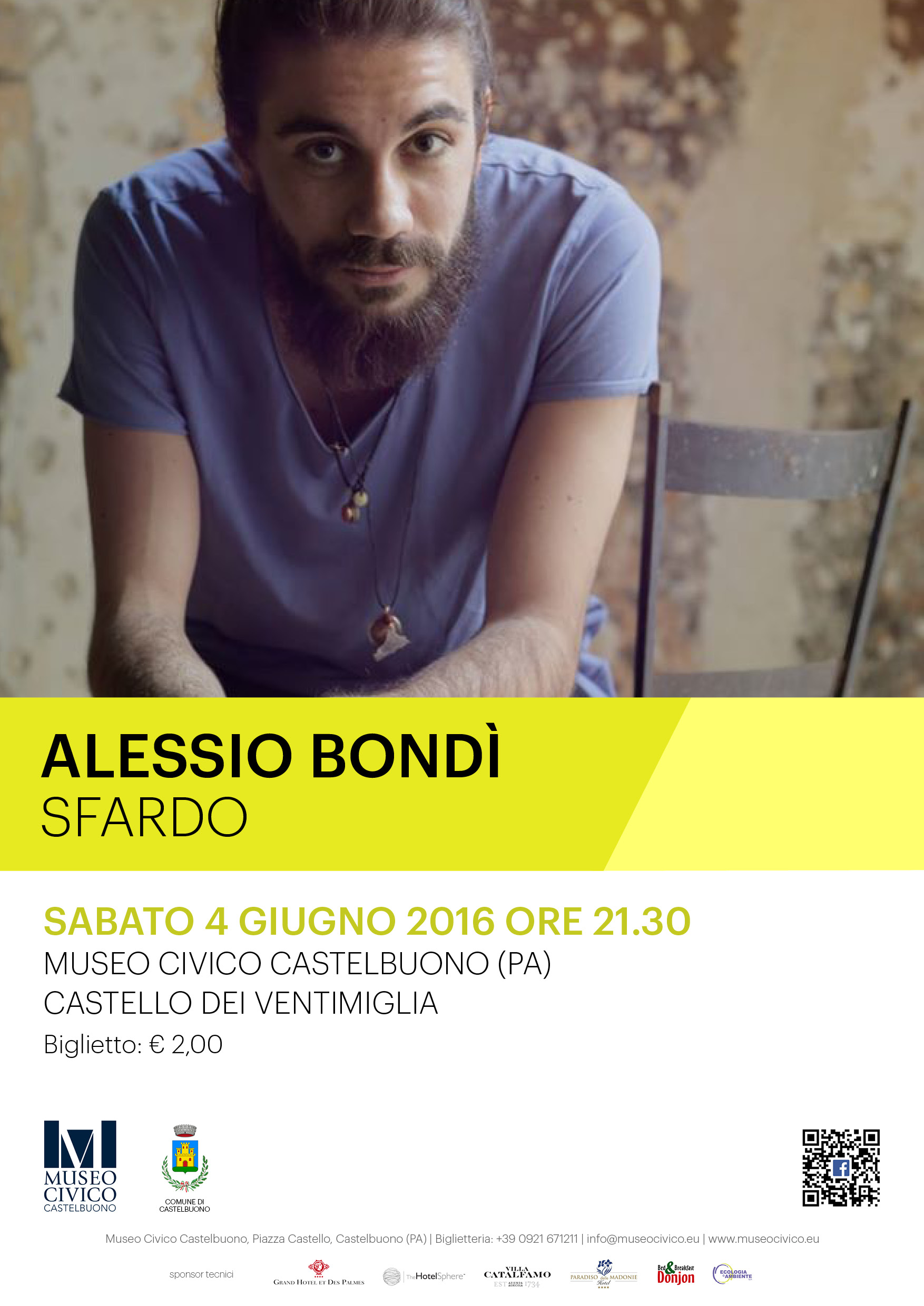 Il Museo Civico di Castelbuono ha il piacere di ospitare all’interno del Castello dei Ventimiglia il concerto del cantautore siciliano Alessio Bondì, terzo appuntamento del ricco programma della stagione concertistica 2016 dedicata alla musica contemporanea (pop, indie, rock, classica) con il coinvolgimento di alcuni dei più interessanti artisti della scena nazionale e internazionale invitati ad esibirsi nei suggestivi spazi del castello medievale sede del Museo.
