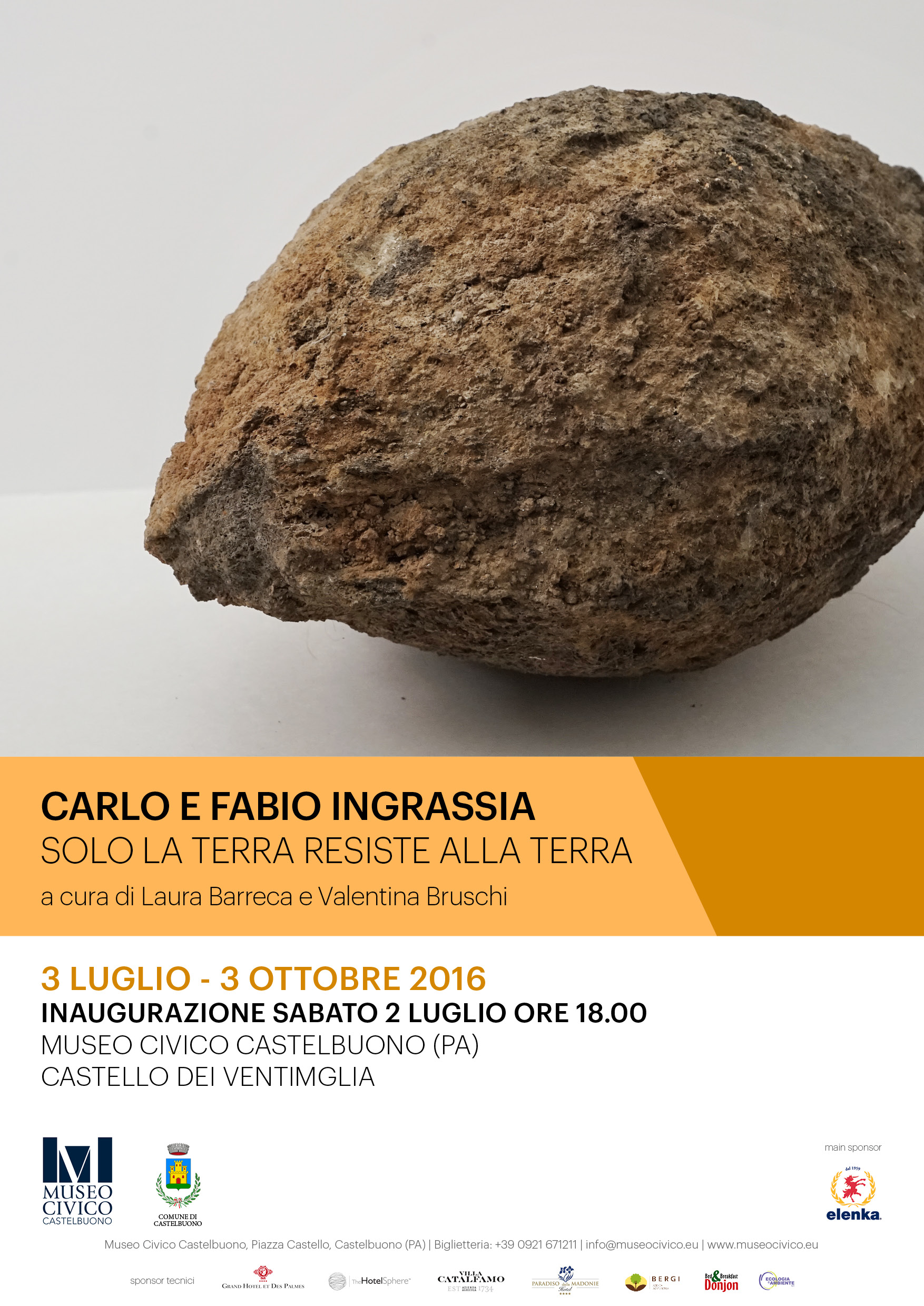 Sabato 2 luglio 2016 alle ore 18 il Museo Civico di Castelbuono è lieto di presentare al pubblico Solo la terra resiste alla terra, personale di Carlo e Fabio Ingrassia, a cura di Laura Barreca e Valentina Bruschi, in linea con l’attività dell’istituzione che mira a promuovere i linguaggi del contemporaneo e l’intreccio di questi con il territorio. La mostra prende spunto dalla prima antologica degli artisti, curata da Cornelia Lauf al Museo MACRO di Roma l’anno scorso, e presenta circa sei opere – tra lavori bidimensionali e scultorei - la metà delle quali realizzate appositamente per l’occasione e pensate per gli spazi del primo piano del trecentesco Castello dei Ventimiglia, fortemente caratterizzato architettonicamente con archi e pareti in pietra.