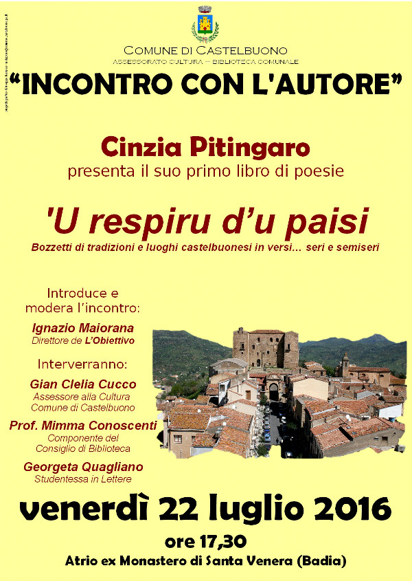 Nell'ambito della rassegna “incontro con l'autore” Venerdì 22 luglio 2016 alle ore 17.30 presso l’atrio della Badia, verrà presentato il libro di poesie “U respiru d’u paisi” di Cinzia Pitingaro.