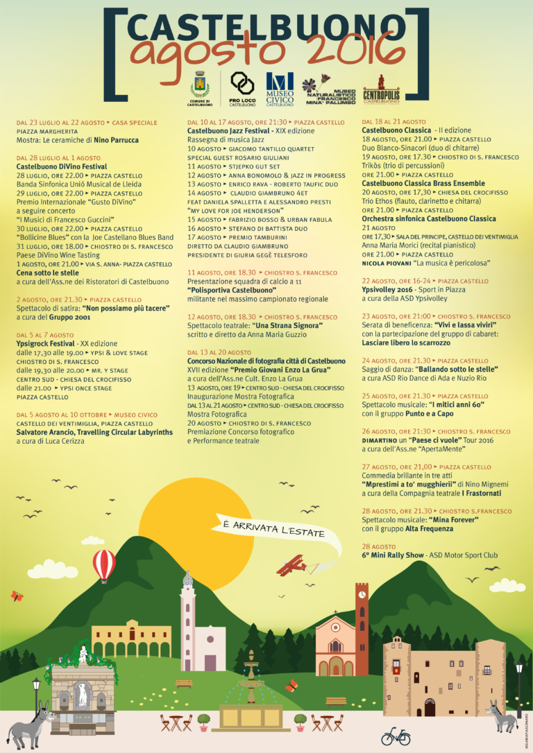 Nutrito e variegato il calendario di manifestazioni culturali e sportive messo in cantiere dall’Assessorato alla Cultura per “Castelbuono Agosto 2016”. In allegato la locandina con tutti gli appuntamenti predisposti e che si chiuderanno il prossimo 28 agosto. Le iniziative dell’Estate Castelbuonese, sono state organizzate con la fattiva collaborazione dell’Amministrazione Comunale, della Pro Loco, del Museo Civico, del Museo Naturalistico “Francesco Minà Palumbo” e da Centropolis.