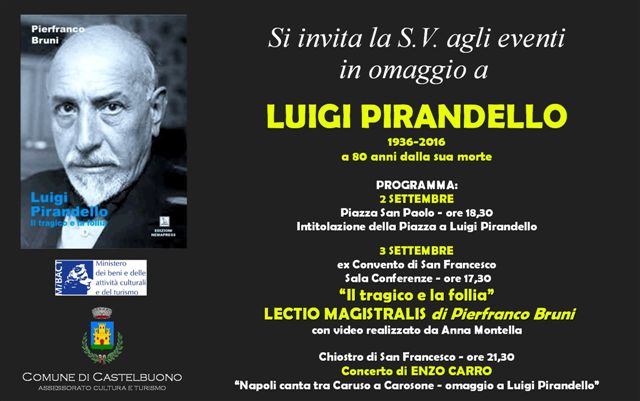 Omaggio a Luigi Pirandello ad 80 anni dalla sua morte con due appuntamenti culturali il 2 e 3 settembre 2016. Lectio Magistralis del prof. Pierfranco Bruni su "Il Tragico e la Follia"