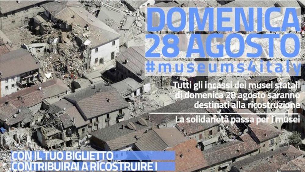Il Museo Civico di Castelbuono aderisce all’iniziativa #museums4italy indetta dal Ministero dei Beni Culturali devolvendo l’incasso dei biglietti della giornata di domenica 28 agosto alle popolazioni terremotate, così come comunicato dal Ministro Dario Franceschini, immediatamente dopo i tragici fatti che hanno colpito il centro Italia. I fondi raccolti saranno utilizzati per il recupero dei beni culturali.