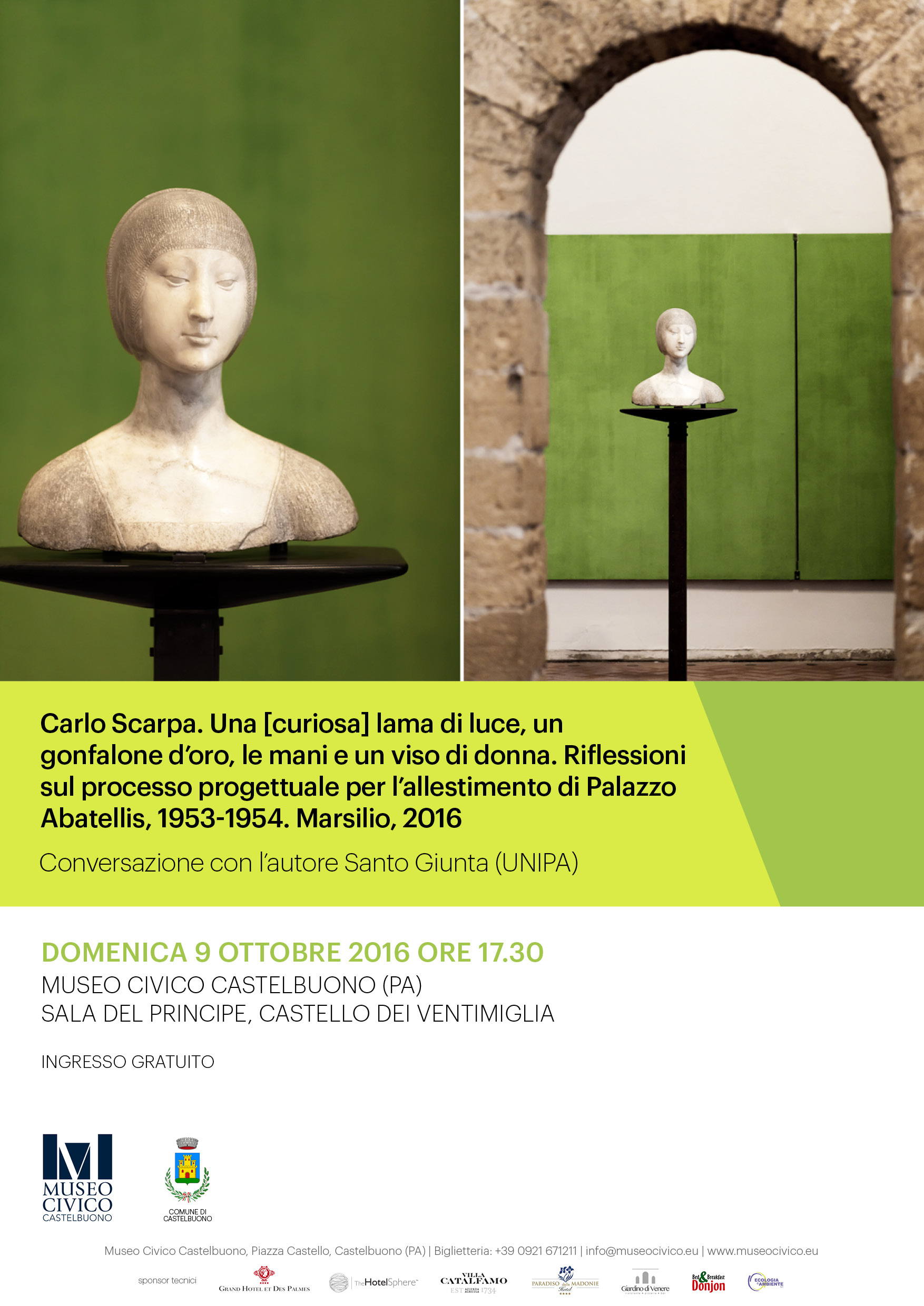 Domenica 9 ottobre 2016 il Museo Civico di Castelbuono è lieto di presentare la conversazione con il Prof. Santo Giunta sulla recente pubblicazione “Carlo Scarpa. Una [curiosa] lama di luce, un gonfalone d’oro, le mani e un viso di donna. Riflessioni sul processo progettuale per l’allestimento di Palazzo Abatellis, 1953-1954 (Marsilio, 2016). Modera l’incontro il Direttore del Museo Civico, Laura Barreca.