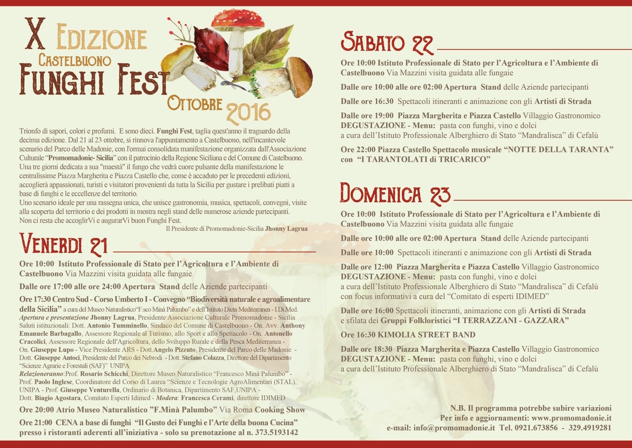 «L’obiettivo – spiega Jhonny Lagrua, presidente dell’Associazione Culturale “Promomadonie” – è quello di promuovere e valorizzare i prodotti legati al territorio, in particolare il fungo. Un viaggio tra la cultura, la storia, le tradizioni e i sapori della nostra terra, che spazia tra degustazioni, visite guidate, escursioni nel Parco delle Madonie, mostre micologiche, conferenze, convegni, cooking show».