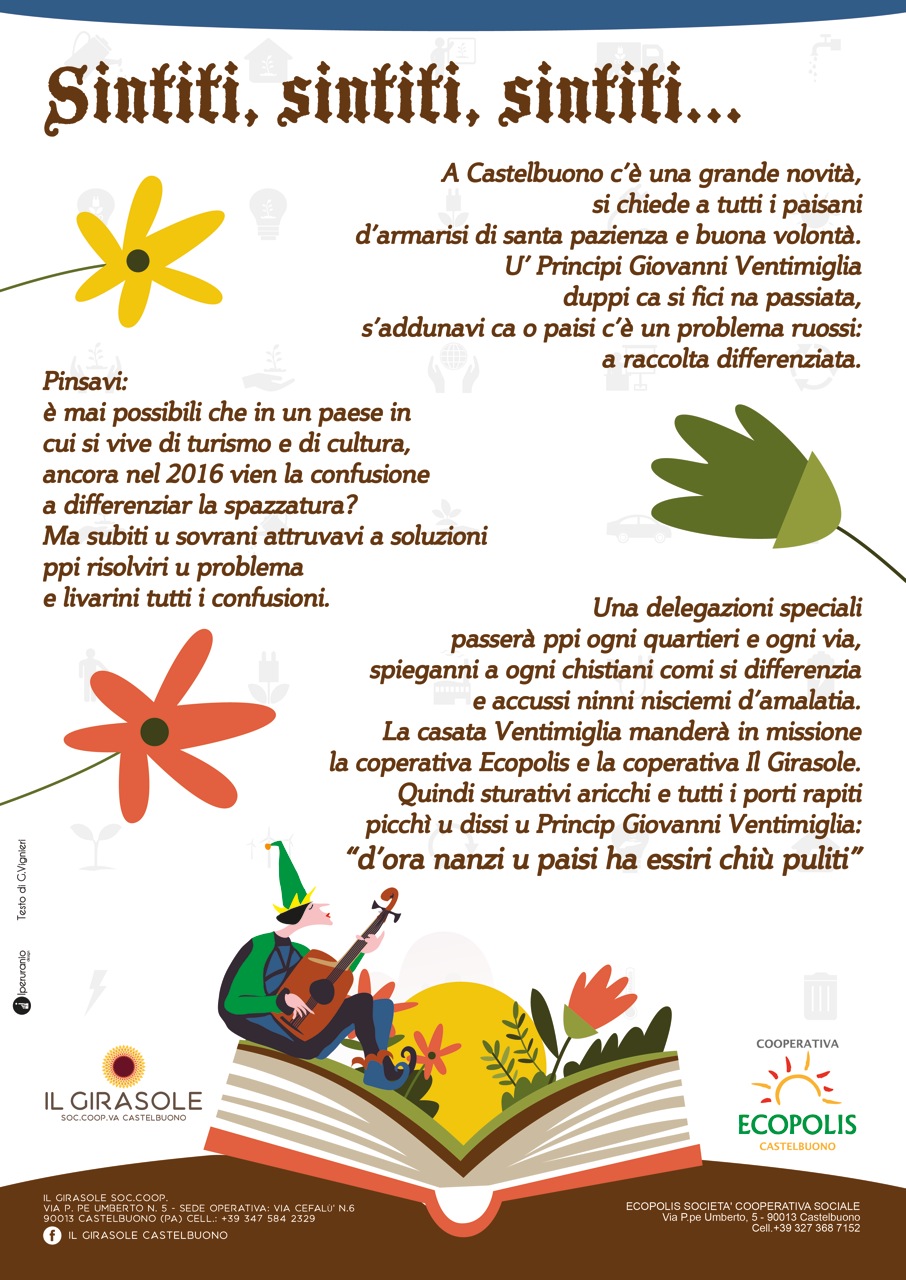 Per dare un maggiore impulso ai cittadini castelbuonesi di effettuare la raccolta diffenziata, le cooperative sociali “Il Girasole” ed “Ecopolis” con il patrocinio del Comune di Castelbuono hanno realizzato un “Eco dizionario” dalla A alla Z. Si tratta di un prezioso vademecum di 24 pagine, graficamente accattivante che, come primo “impatto” sarà ampiamente diffuso nelle scuole, in maniera che il primo passo per una corretta raccolta della differenziata, possa crearsi con una consapevole cultura all'educazione ambientale che parte in primo luogo dai bambini e dai ragazzi che frequentano gli istituti scolastici.