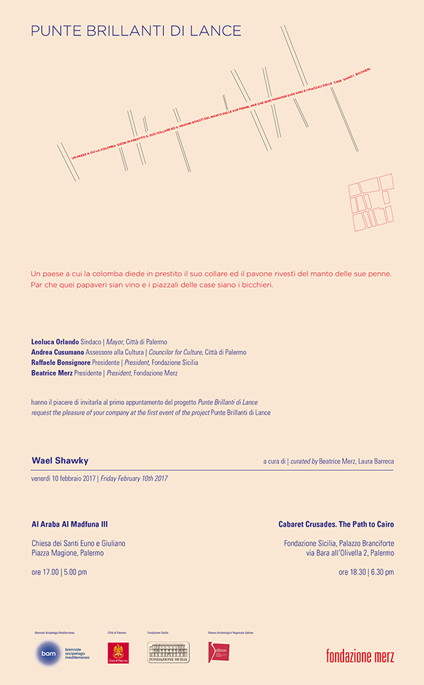 Il Sindaco Leoluca Orlando e l’Assessore alla Cultura del Comune di Palermo, Andrea Cusumano, il Presidente della Fondazione Sicilia, Raffaele Bonsignore, la Presidente della Fondazione Merz di Torino, Beatrice Merz, sono lieti di annunciare l’inaugurazione del primo appuntamento del progetto Punte brillanti di lance, con le videoinstallazioni dell’artista egiziano Wael Shawky (Alessandria d’Egitto, 1971). Il progetto, a cura di Beatrice Merz e Laura Barreca, rientra nel programma di iniziative di BAM-Biennale Arcipelago Mediterraneo.