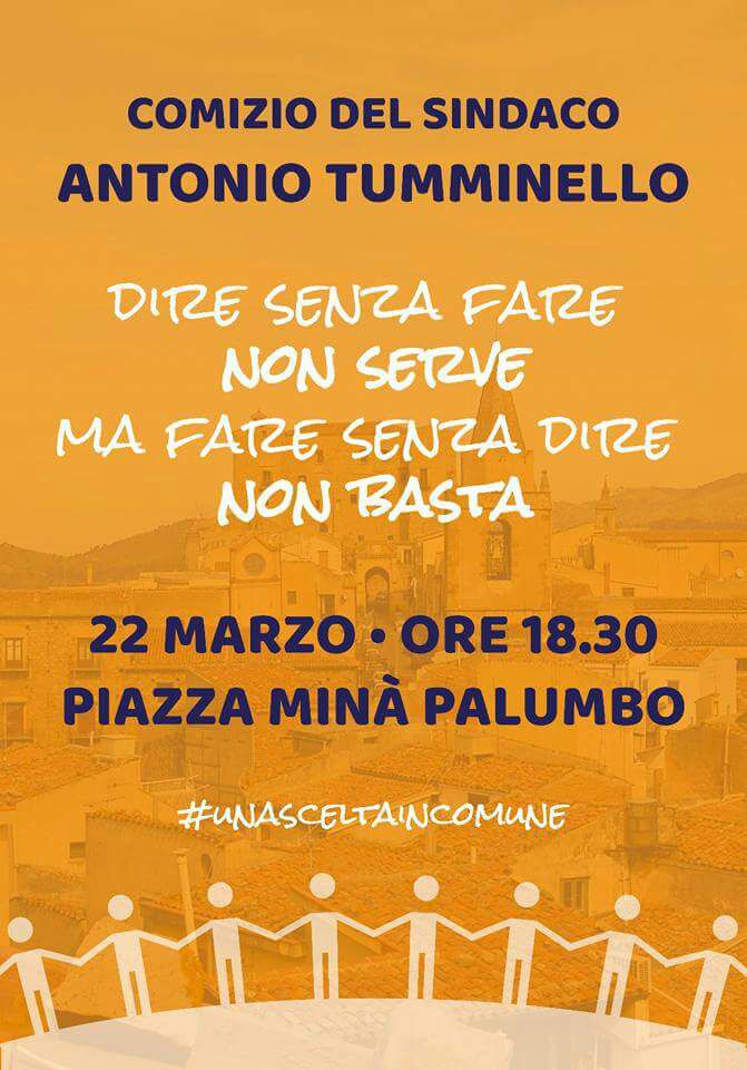 Mercoledì 22 marzo alle ore 18:30, comizio del sindaco Antonio Tumminello in Piazza Francesco Minà Palumbo.