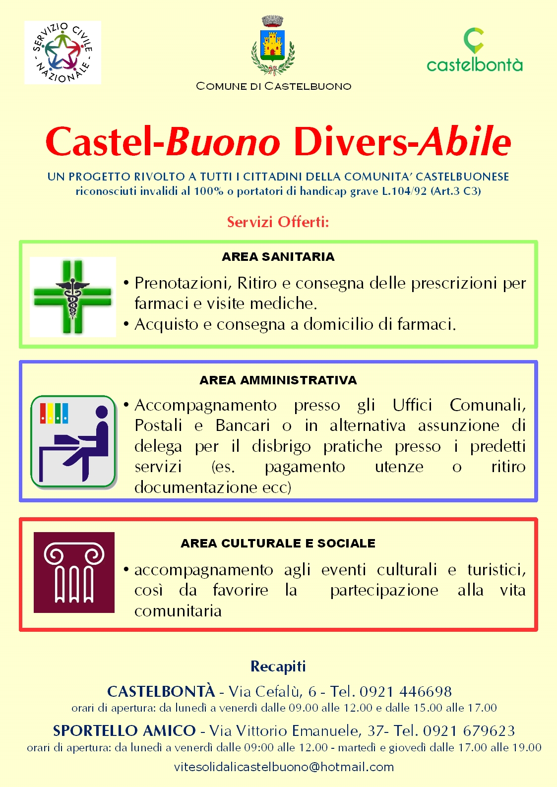 Il Comune di Castelbuono in collaborazione con il Servizio Civile Nazionale, la Coop. Castelbontà e Sportello Amico presentano "Castel-Buono Divers-Abile", un progetto rivolto a tutti i cittadini della comunita’ castelbuonese riconosciuti invalidi al 100% o portatori di handicap grave L.104/92 (Art.3 C3).