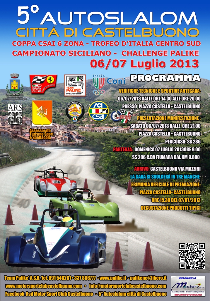 La competizione automobilistica promossa dal Team Palikè Palermo, in stretta sinergia con il locale Motor Sport Club, sarà valevole quest'anno quale terzo appuntamento del Trofeo d'Italia centro sud della specialità, nonché quale terza prova di Coppa Csai 6a zona Slalom ed ancora quale quarta tappa per lo Challenge Palikè 2013. Una promozione senza dubbio meritata, che assicura inoltre la validità per il Campionato siciliano Aci Csai Slalom. Le iscrizioni, che già fioccano numerose, si potranno inviare sino ad un minuto dalla mezzanotte di lunedì 1° luglio. Tra i sicuri presenti, spiccano i trapanesi Andrea Raiti (mattatore della stagione sin qui in atto, con i suoi cinque successi parziali), su Radical SR4 Suzuki, Pietro Raiti (Radical Prosport Suzuki) e Nicolò Incammisa (Osella PA 21S Honda).