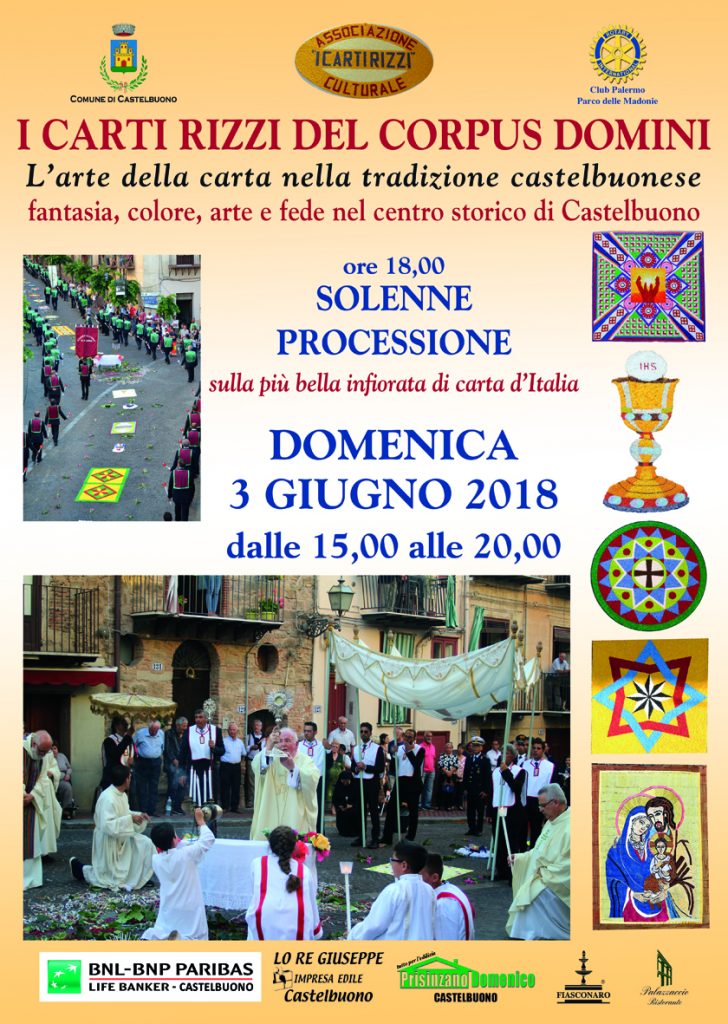 Ritorna l’infiorata di Carti Rizzi del Corpus Domini che quest’anno cade il 3 giugno prossimo. E’ l’unica infiorata di composizioni di carta presente in Italia ed è particolarmente suggestiva perchè legata alla solenne processione alla quale partecipano 18 confraternite e circa 1000 confrati.