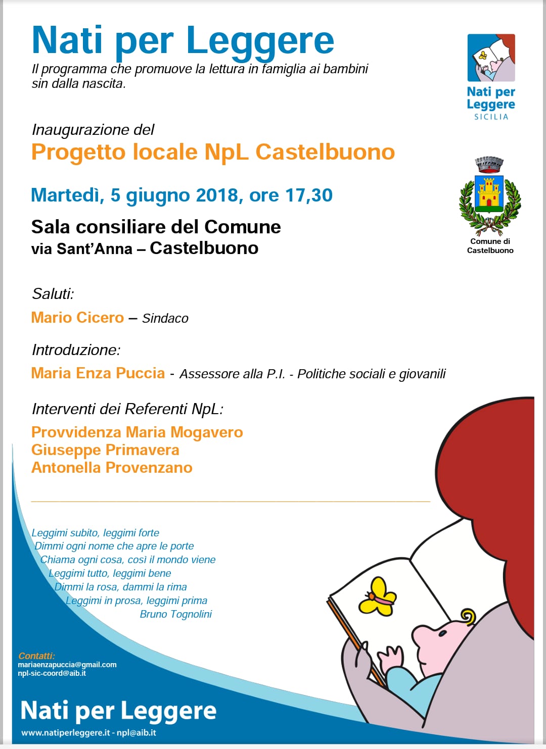 L’Amministrazione Comunale di Castelbuono in collaborazione con la Biblioteca ha il piacere di invitare la cittadinanza alla presentazione di “Nati Per Leggere” un progetto nazionale di promozione della lettura rivolto alle famiglie con bambini da zero a sei anni promosso dall’Associazione culturale pediatri, dall’associazione italiana biblioteche e dal centro per la salute del bambino.
