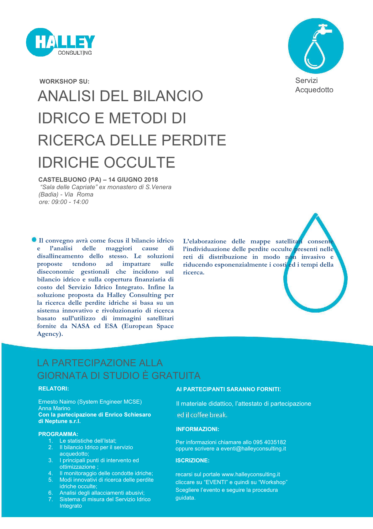 Giovedì 14 giugno, dalle ore 9 alle ore 14, presso la Sala delle Capriate dell'ex Monastero di Santa Venera (Badia) a Castelbuono, la Halley Consulting S.p.A., partner tecnologico del Comune di Castelbuono, organizza un Workshop del tutto gratuito, nel corso del quale verranno illustrati i propri sistemi innovativi e rivoluzionari nella ricerca di soluzioni all'avanguardia, i quali, servendosi di strumentazione satellitare, consentiranno agli Enti l'individuazione delle perdite occulte presenti nelle reti di distribuzione idriche in modo non invasivo e riducendo esponenzialmente i costi ed i tempi della ricerca stessa.