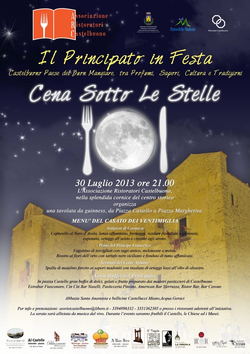 L’Associazione Ristoratori Castelbuono nell’ambito dell’iniziativa “Il Principato in festa”, Castelbuono Paese del buon mangiare, tra profumi, sapori, cultura e tradizioni, con il Patrocinio del Comune di Castelbuono, organizza per la prima volta, giorno 30 luglio 2013 ore 21.00 la manifestazione “CENA SOTTO LE STELLE”, una iniziativa inserita nella splendida cornice del centro storico di Castelbuono, che vedrà una tavolata da guiness da Piazza Castello a Piazza Margherita.