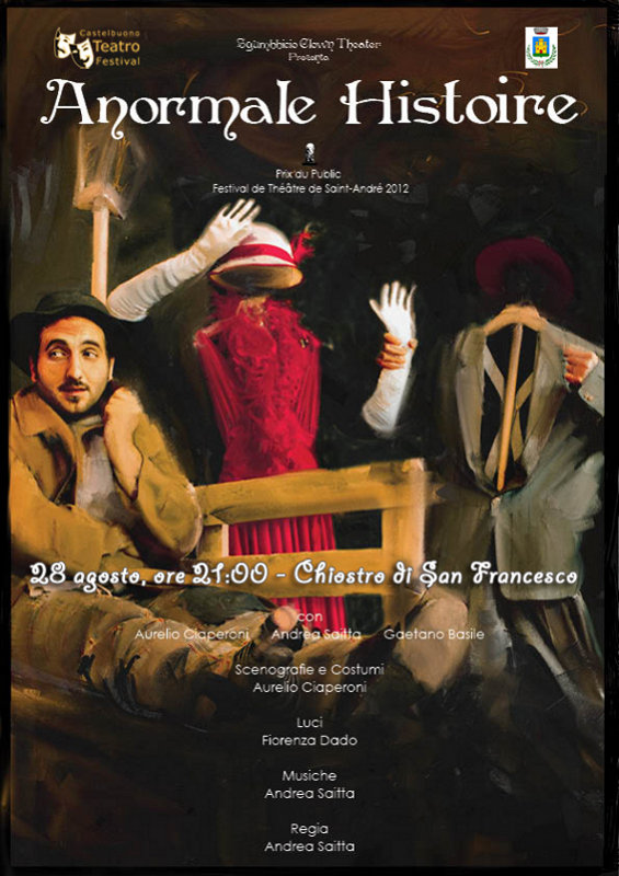 28 agosto ore 21.00 presso “Chiostro di San Francesco”: La compagnia “Sgumbbicio – Clown Theater” presenta “Anormale Histoire” di e con Andrea Saitta, Gaetano Basile, Aurelio Ciaperoni. Regia di Andrea Saitta.