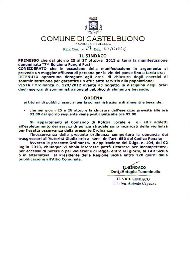 Ordinanza Sindacale n.127 del 25 ottobre 2013 - Deroga orario di chiusura pubblici esercizi