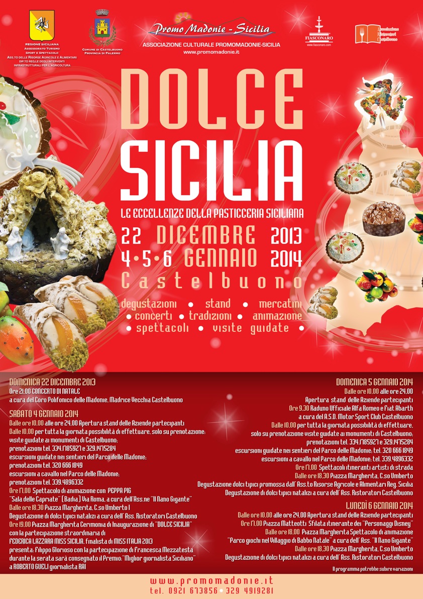 Giorno 22 dicembre e nei giorni 3, 4 e 5 gennaio, l'Associazione Culturale Promomadonie-Sicilia organizza a Castelbuono la manifestazione "DOLCE SICILIA", dove saranno in scena le eccellenze della pasticceria siciliana con degustazioni, stand, mercatini. Faranno da contorno concerti, animazione e visite guidate.