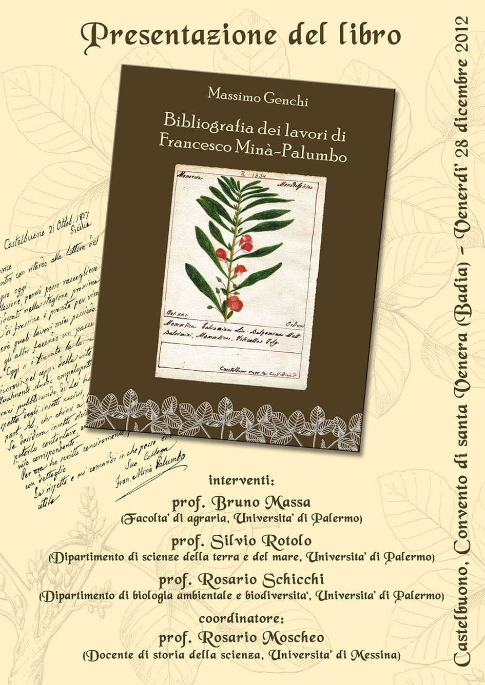 - il professore Rosario Schicchi, del dipartimento di scienze botaniche dell’Università di Palermo, parlerà dell’opera scientifica di Minà Palumbo alla luce degli ultimi ritrovamenti;