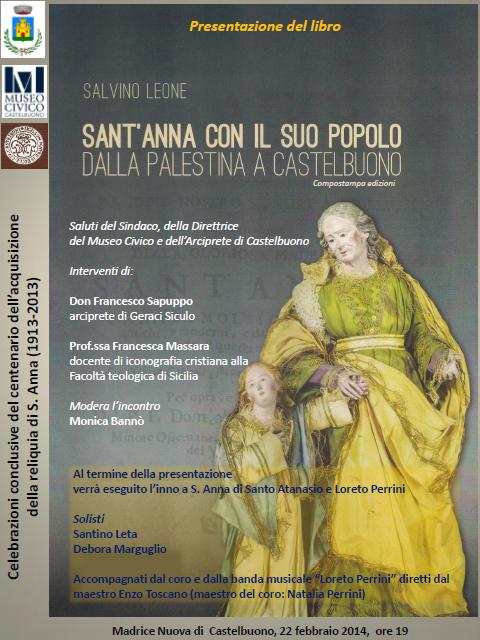 A conclusione dell’anno del centenario della donazione della Sacra Reliquia al Comune di Castelbuono e al suo popolo è prevista la presentazione del libro del Prof. Salvino Leone dal titolo Sant’Anna con il suo popolo dalla Palestina a Castelbuono, che ripercorre gli elementi storici della vita di Sant’Anna e del trasferimento delle sue Reliquie.