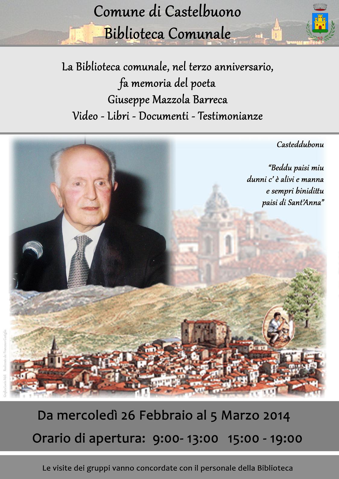 La Biblioteca Comunale, nel terzo anniversario, fa memoria del Poeta Giuseppe Mazzola Barreca. In mostra video, libri, documenti, testimonianze.