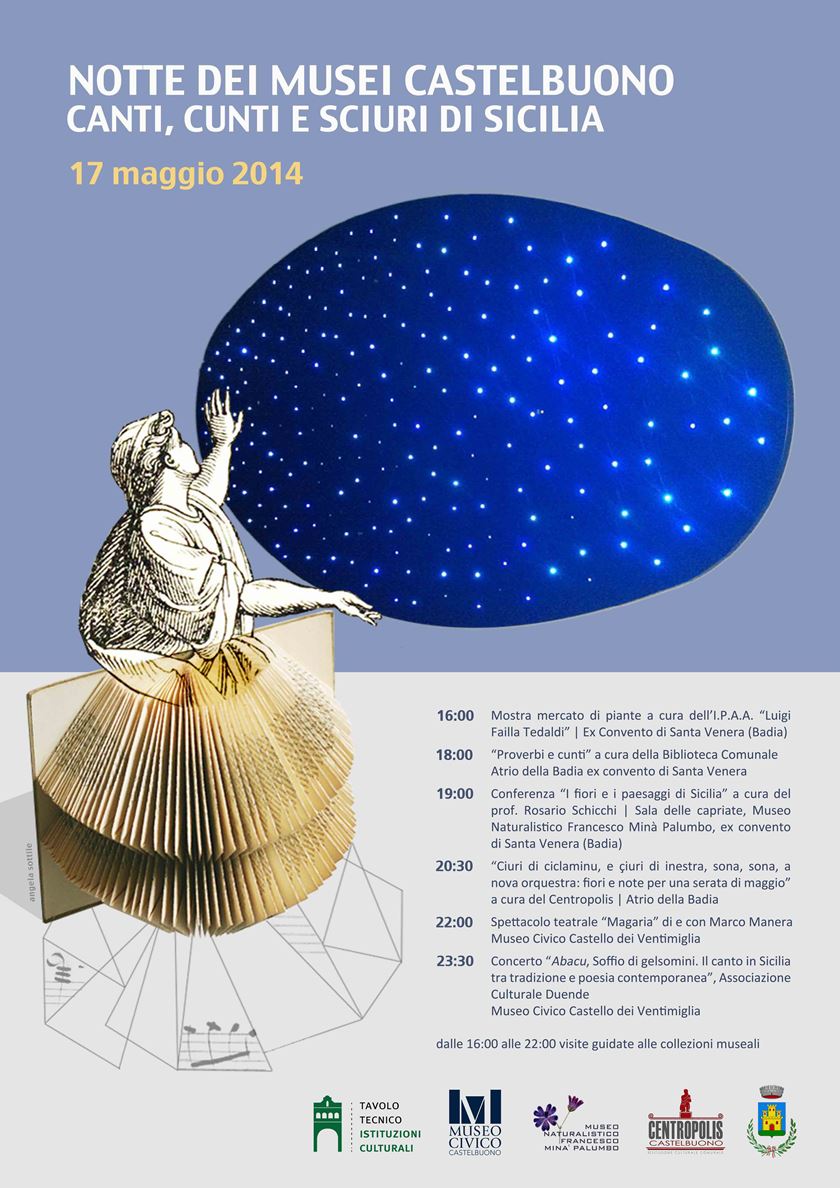 La notte porta consiglio; quella del 17 maggio porta cultura. Il Museo Civico, il Museo Naturalistico Francesco Minà Palumbo, la Biblioteca Comunale ed il Centropolis aderiscono alla “Notte dei Musei”, iniziativa di portata internazionale che vede uniti, e svegli, tantissimi musei di tutta Europa, pronti ad accogliere gratuitamente, ben oltre il tramonto, i visitatori. Anche a Castelbuono, dunque, il 17 maggio 2014 le istituzioni culturali offriranno eventi speciali, visite guidate e aperture gratuite nei luoghi della cultura, attraverso un percorso multisensoriale tra le note dei canti, quelle meno note dei cunti e le note profumate dei sciuri di Sicilia.