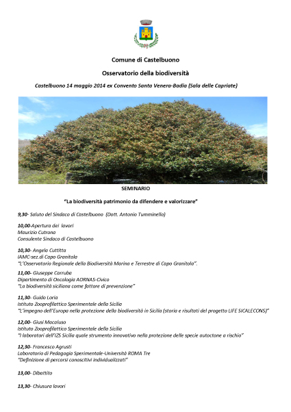 In occasione del seminario il Sindaco di Castelbuono, Dott. Antonio Tumminello, presenterà ufficialmente l’Osservatorio della biodiversità nato dalla consapevolezza che la conservazione e la valorizzazione della biodiversità locale rappresenta un passo fondamentale per la tutela del territorio, del paesaggio e per la salute dei cittadini.