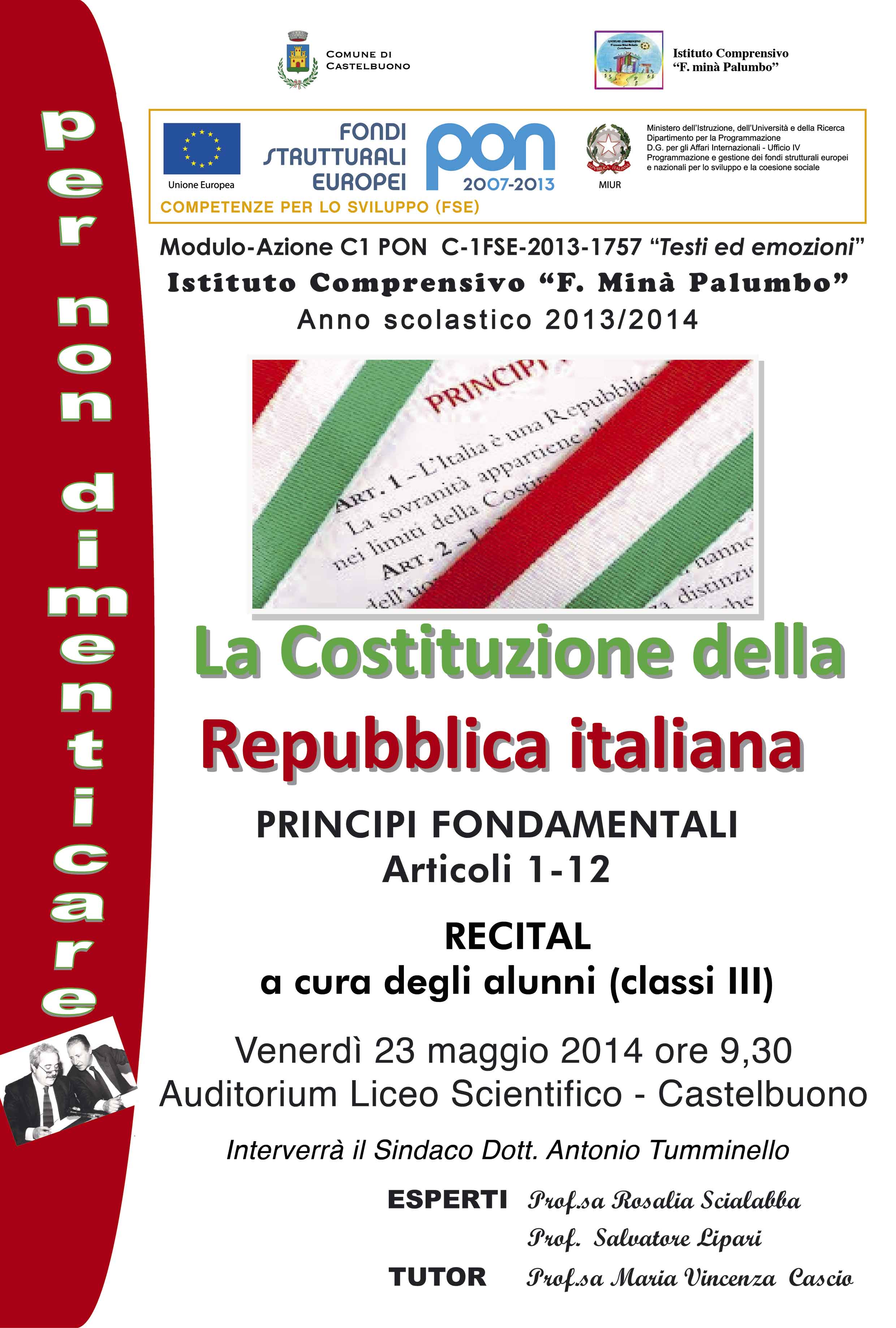 Venerdì 23 maggio alle ore 9,30 presso l'Auditorium del Liceo Scientifico di Castelbuono, gli alunni dell'Istituto Comprensivo presentano il recital "La Costituzione della Repubblica Italiana".