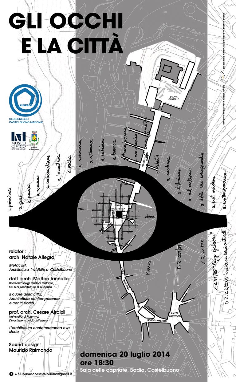 Il Club Unesco Castelbuono Madonie, in collaborazione con il Museo Civico di Castelbuono e il Comune di Castelbuono, vi invitano a partecipare domenica 20 luglio 2014, nella “Sala delle Capriate” presso la Badia a Castelbuono, alla conferenza dal titolo “Gli occhi e la città” nella quale si discuterà del rapporto tra architettura contemporanea e contesti storici consolidati, partendo da una “passeggiata progettuale”, quasi visionaria, nel cuore della cittadina castelbuonese, accompagnati dalle contaminazioni musicali di Maurizio Raimondo.
