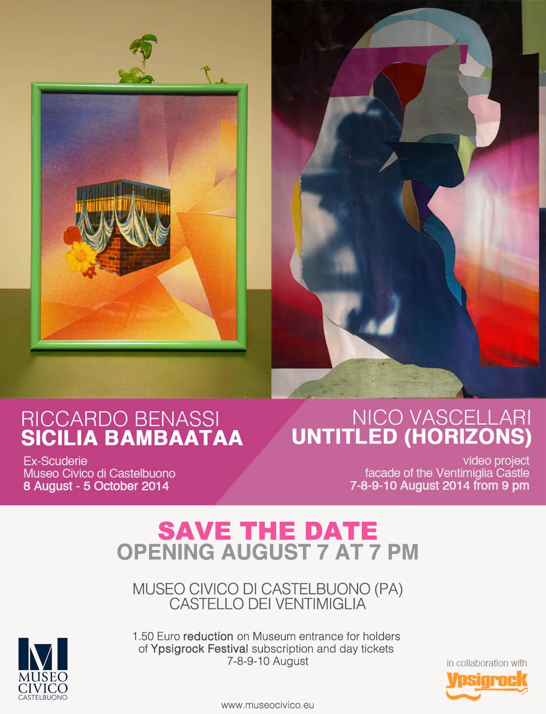 Il Museo Civico di Castelbuono, in occasione del Festival Ypsigrock 2014, è lieto di presentare la mostra Sicilia Bambaataa, un progetto di Riccardo Benassi all’interno degli spazi espositivi delle ex-scuderie del Castello dei Ventimiglia, e Untitled (Horizons), una compilation visiva immaginifica di Nico Vascellari, proiettata sulla facciata del Castello durante le serate dei concerti di Ypsigrock Festival 2014.