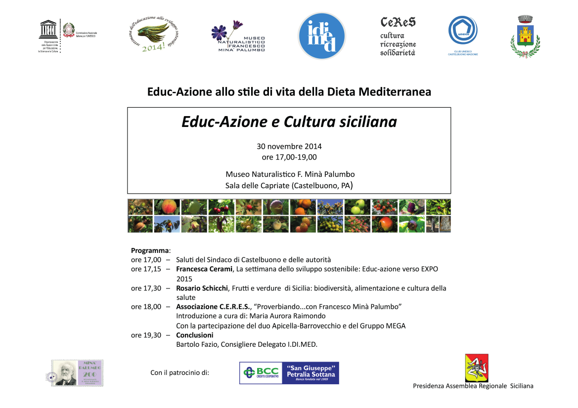 La giornata prevista alla Sala delle Capriate, giorno 30 novembre alle ore 17,00, rientra nell’ambito delle manifestazioni per il Bicentenario di Francesco Minà Palumbo. Essa è organizzata dal Museo F. Minà Palumbo, dall’I.Di.Med., dall’Associazione C.E.R.E.S. di Castelbuono e dal Club Unesco Castelbuono-Madonie e riguarda Educ-Azione e Cultura siciliana.