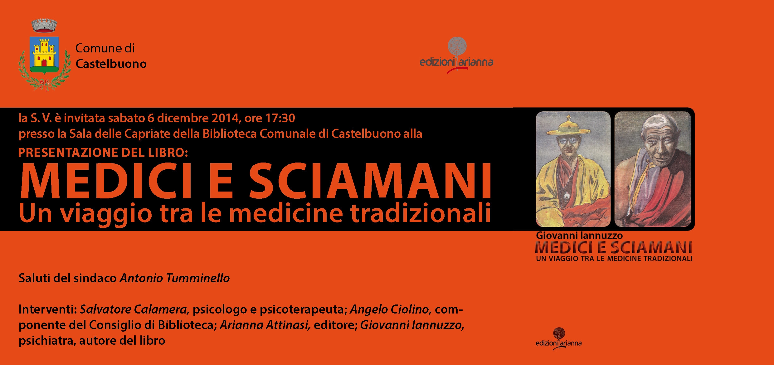 Sabato 6 dicembre p.v., alle ore 17.30, presso la biblioteca comunale, Sala delle Capriate, presentazione del libro Medici e Sciamani. Un viaggio tra le medicine tradizionali. Il volume-novità, edito dalla casa editrice Edizioni Arianna, nella collana Psiche, Medici e Sciamani. Un viaggio tra le medicine tradizionali, del dottor Giovanni Iannuzzo, medico psichiatra della Comunità terapeutica Fauni di Castelbuono.