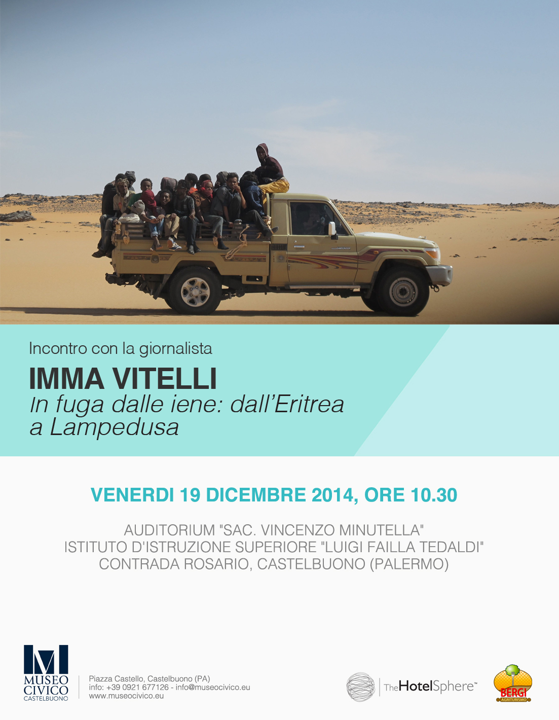 Il Museo Civico di Castelbuono è lieto di presentare l’incontro con la giornalista Imma Vitelli dal titolo, In fuga dalle iene: dall’Eritrea a Lampedusa, che si terrà venerdì 19 dicembre 2014 alle ore 10.30 presso l’Auditorium “Sac. Vincenzo Minutella” dell’Istituto d'Istruzione Superiore "Luigi Failla Tedaldi" di Castelbuono.