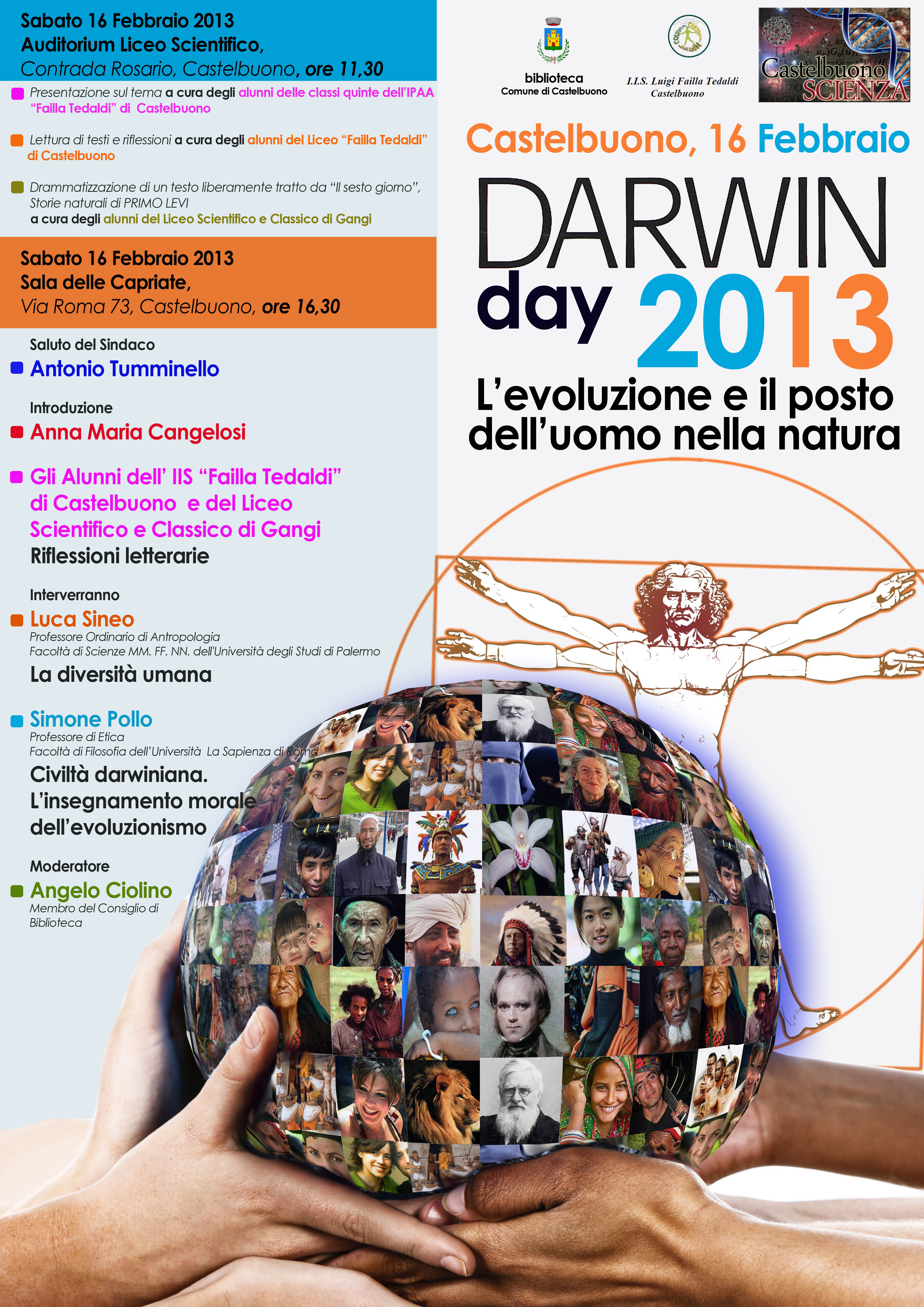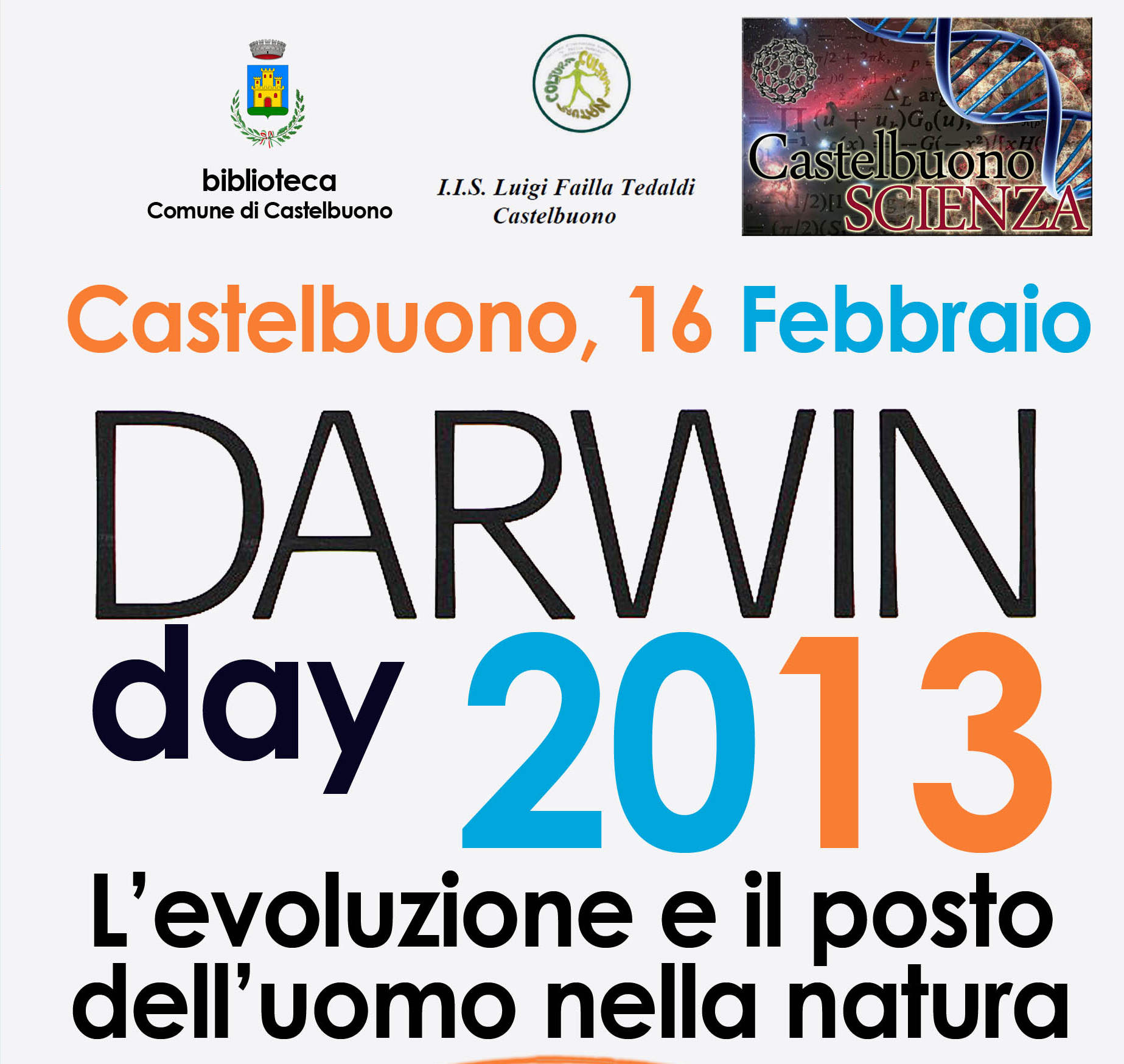 Sabato 16 febbraio il Darwin Day 2013 sarà celebrato a Castelbuono a partire dalle ore 11,30 presso l'Auditorium del Liceo Scientifico in C.da Rosario e dalle ore 16,30 presso la Sala delle Capriate dell'ex Monastero di Santa Venera (Badia) in via Roma.
