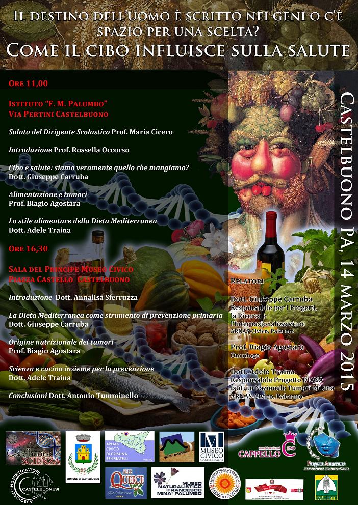 Ore 16,30 Conferenza tenuta presso la Sala del Principe del Castello dei Ventimiglia, dal titolo "Il destino dell'uomo è scritto nei geni o c'è spazio per una scelta?Come il cibo influisce sulla salute", relatori: il Prof. Giuseppe Carruba, il Prof. Biagio Agostara e la Dott.ssa Adele Traina. Durante l’incontro si procederà anche all’iscrizione dei partecipanti al corso di cucina preventiva.
