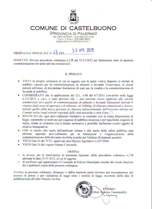 Si pubblica in allegato l’Ordinanza Sindacale n. 48 del 30.04.2015 di liberalizzazione degli orari per gli esercizi di somministrazione di alimenti e bevande.