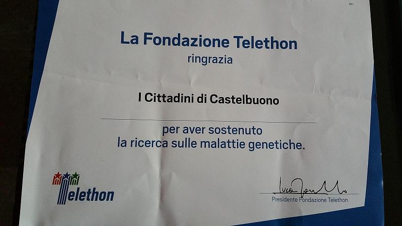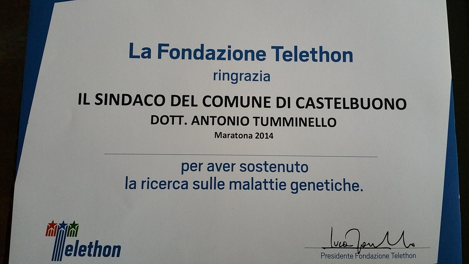 E’ con vero piacere che comunico che la FONDAZIONE TELETHON ci ha trasmesso in questi giorni due pergamene con i ringraziamenti in favore dello scrivente e dei cittadini di Castelbuono, per aver sostenuto la ricerca sulle malattie genetiche in occasione della maratona 2014.