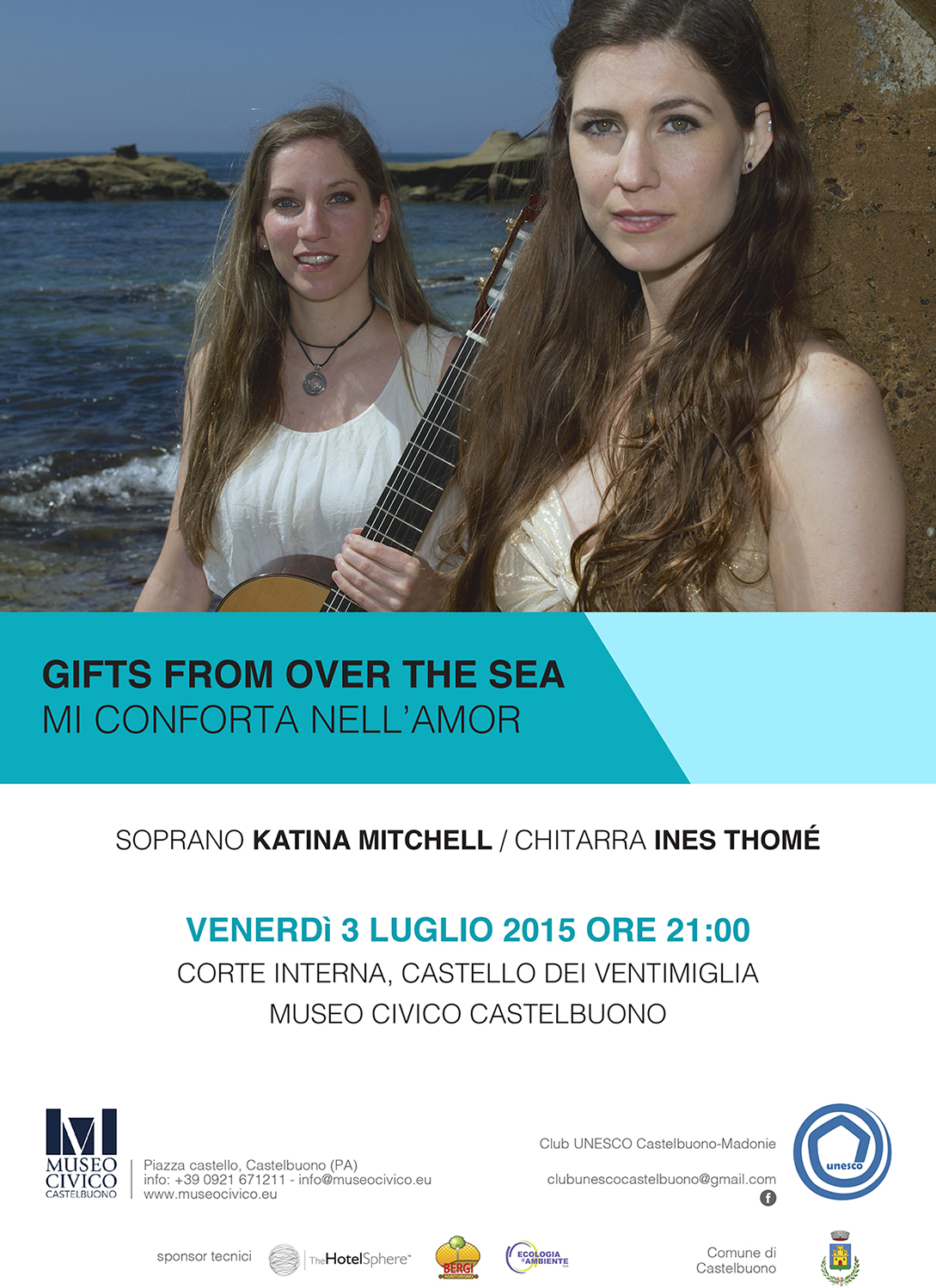 Il Museo Civico di Castelbuono è lieto di presentare il concerto Gifts from Over the Sea del Soprano Katina Mitchell e Ines Thomè realizzato in collaborazione con il Club Unesco di Castelbuono. Il concerto delle due giovani musiciste presenta un repertorio con brani, tra gli altri di Bellini e de Falla, all’interno dell’architettura medievale del Castello dei Ventimiglia. Le due affermate artiste hanno alle spalle una intensa carriera musicale sia da soliste che in gruppo.