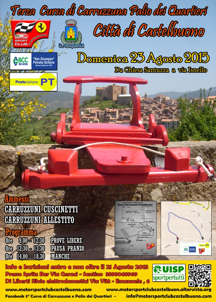 Comunichiamo per evitare perdita di tempo la Domenica mattina (Solo per chi viene da fuori le iscrizioni si effettueranno Domenica) che si possono ritirare le schede di iscrizioni e consegnarle debitamente compilate entro il 21 Agosto 2015 per la Terza Cursa di Carruzzuna presso Spritz Bar in via Geraci o presso Di Liberti Silvio in Via Vittorio Emanuele 6 o chiamate Santino Fiasconaro 3898068969, Contiamo sulla collaborazione di tutti.