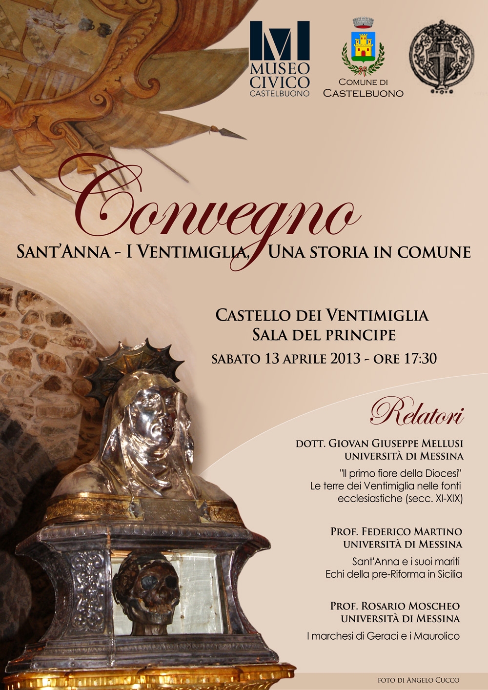 Nell’ambito dell’anno dedicato ai Festeggiamenti del Centenario della donazione del teschio di Sant’anna, il Museo civico è orgoglioso di presentare il convegno, realizzato in collaborazione con l’Amministrazione comunale di Castelbuono e la Società di storia patria di Messina, dal titolo “ Sant’Anna, I Ventimiglia: una storia in comune” che si terrà sabato 13 aprile alle ore 17.30 nella sala del Principe del Castello comunale dei Ventimiglia.