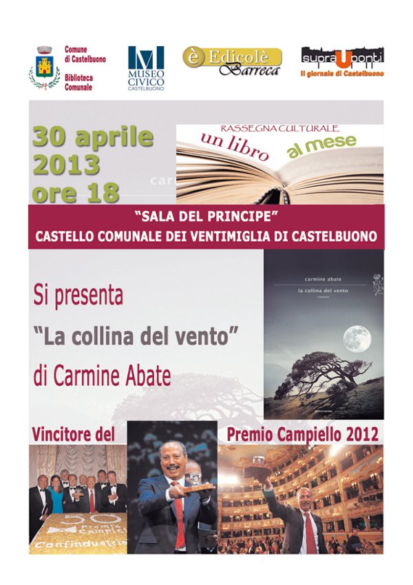 Il 30 aprile torna l'appuntamento con la rassegna culturale "Un libro al mese", curata dal giornale periodico "Suprauponti", da Edicolè e con il patrocinio del Comune di Castelbuono, del Museo Civico e della locale Biblioteca Comunale. Alla sala del Principe del Castello dei Ventimiglia, con inizio alle ore 18, si parlerà, alla presenza dell'autore, del libro "La collina del vento" di Carmine Abate, edito da Mondadori, vincitore nel 2012 del prestigioso Premio Campiello.