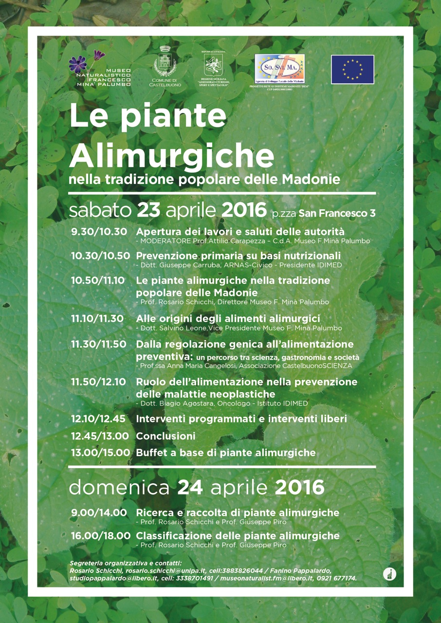 - Sabato 23 aprile si terrà un convegno nei nuovi locali del Museo, siti a Castelbuono in Piazza San Francesco, 3, in cui diversi relatori metteranno in evidenza il ruolo dell’alimentazione nella prevenzione primaria di diverse patologie e l’importanza delle piante alimurgiche nella cucina tradizionale delle Madonie.