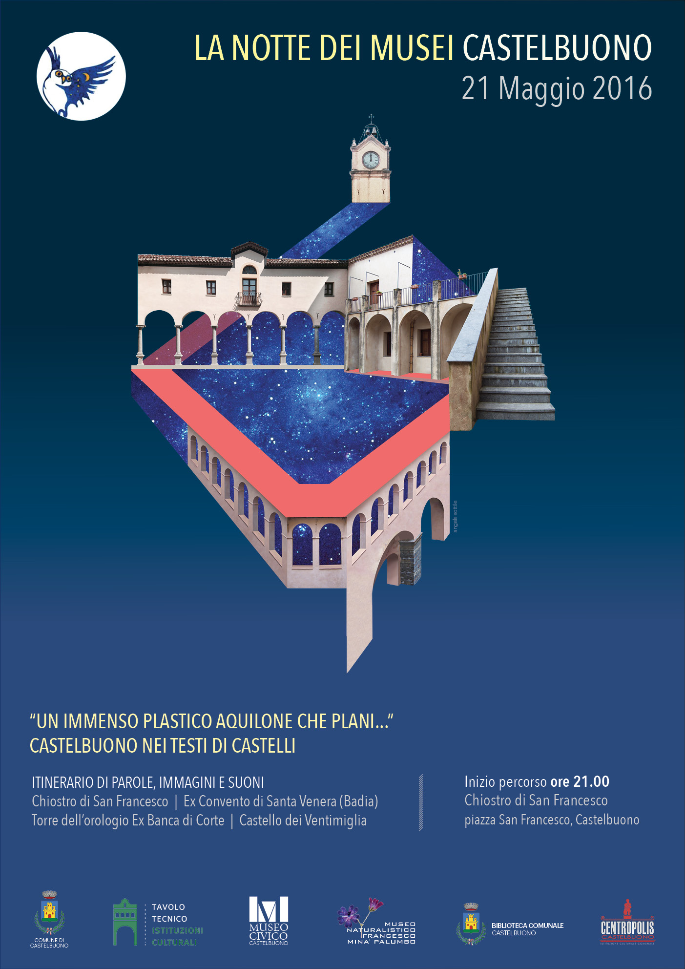 Il progetto itinerante di parole, immagini e suoni si articolerà attorno al Chiostro di San Francesco, all’Ex Convento di Santa Venera – Badia (sede del Museo Francesco Minà Palumbo), alla Torre dell’Orologio (Ex Banca di Corte) e al Castello dei Ventimiglia (sede del Museo Civico) con la lettura di alcuni brani tratti dagli scritti del Castelli, a cui è dedicata la Notte dei Musei 2016 a Castelbuono. Interpreti delle letture saranno: Mario Gugliuzza, Gioacchino Cannizzaro, Angelo Ciolino, Daniela Di Garbo, Massimiliano La Grua, Giuseppe Carrozza, Stefania Sperandeo.